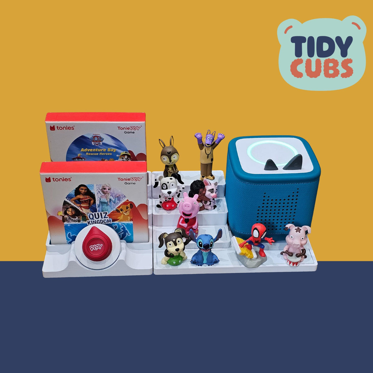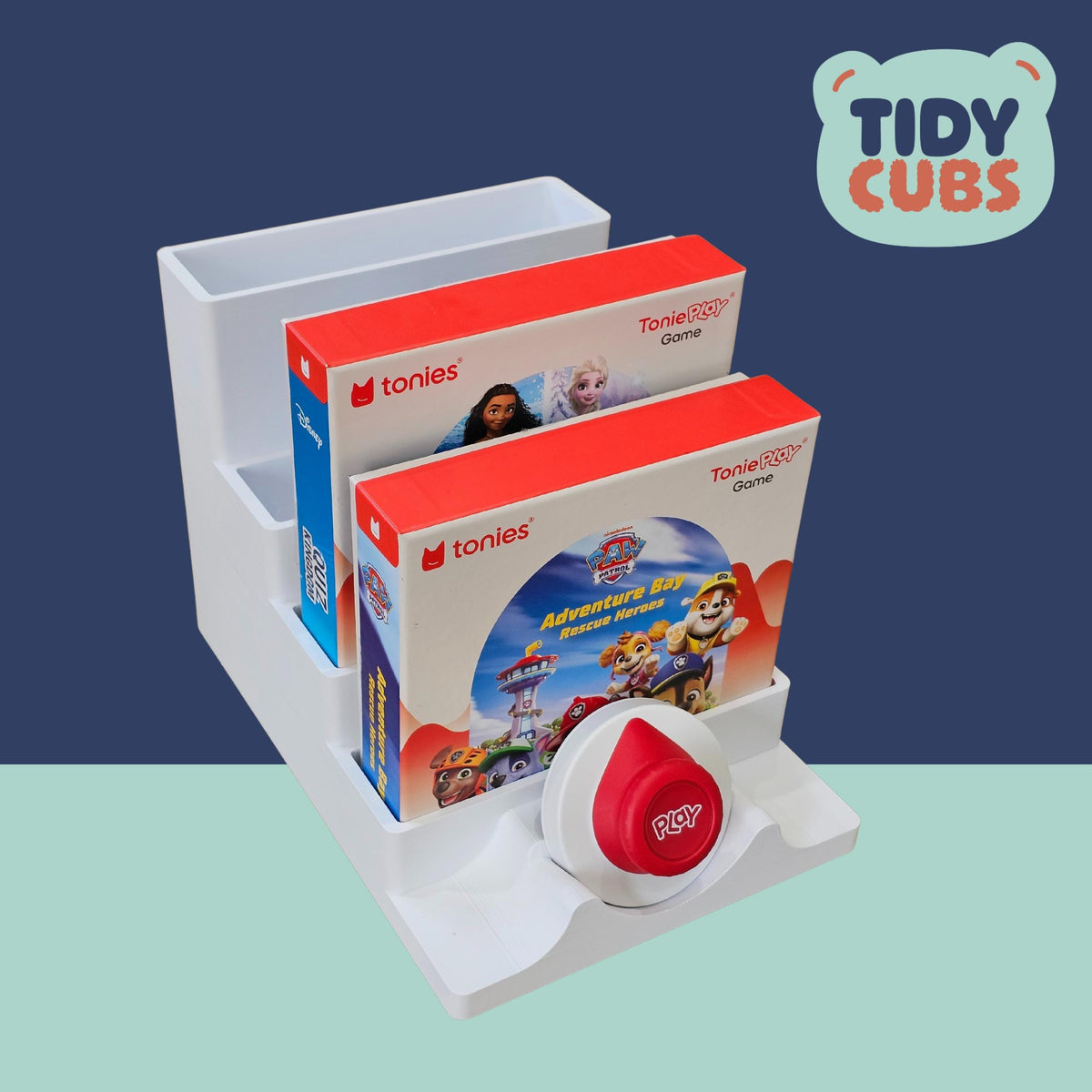 Securely and neatly store your Tonies play games and button on this simple but effective storage station. A great way to present your kids Tonies items and let them organise them however they wish. Designed specifically to fit the Toniebox 2 and Tonie Play and is not compatibile with older Tidycubs products that were for the original box. The Large holds up to 4 Tonie Play games when neatly stored in their box for simple access or if the box is lost or damaged the 4 slots can be used to store the relevant items for each game. At the front of the stand is a slot to hold the Tonie play button for easy access. The Medium will hold 3 game boxes and the small will hold 2.
