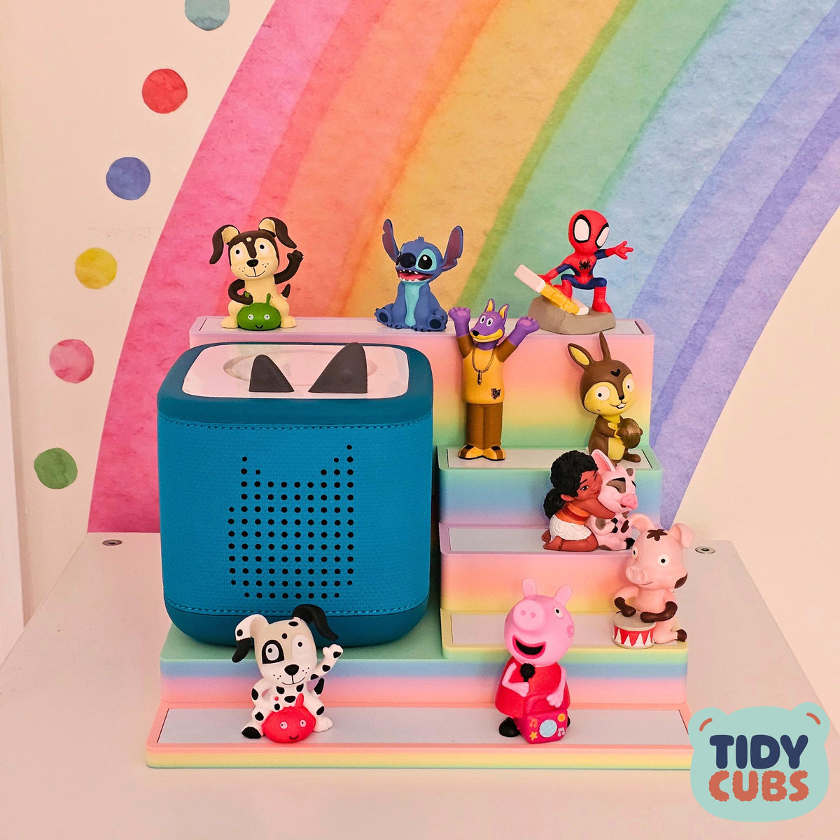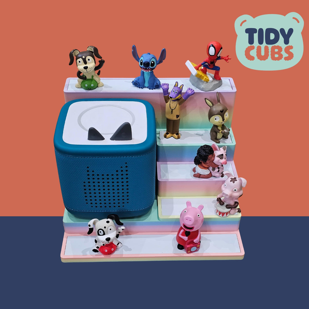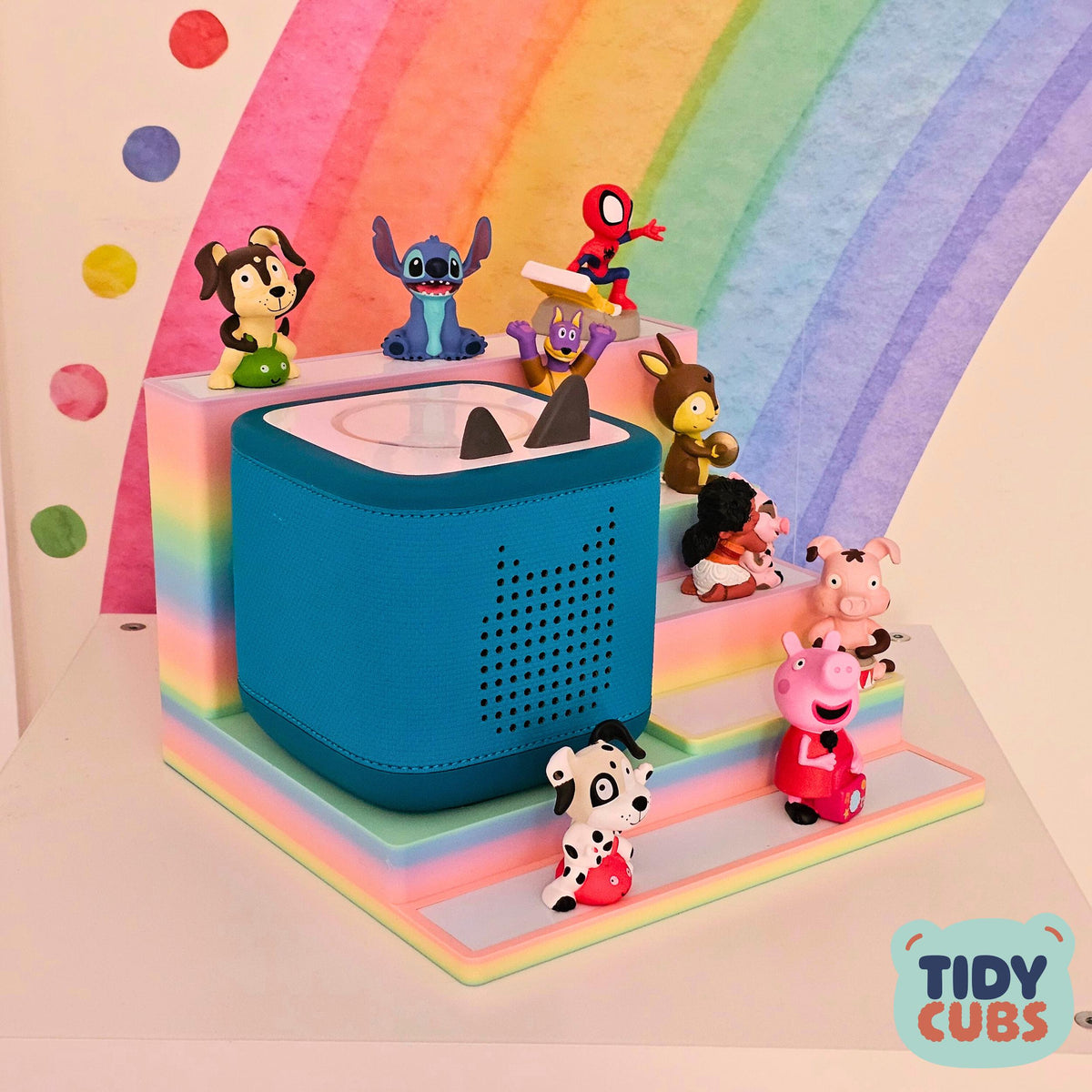 Large Rainbow Modular Tonie Box 2 Docking Station with figure storage acts as a Tonie figure holder for Toniebox 2 stand in kids room decor nursery toy storage Tonies organiser display toy ITEM Securely and neatly store your Tonies figures on this simple but effective storage station. A great way to present your kids Tonies and let them organise them however they wish. Designed specifically to fit the Toniebox 2 and is not compatibility with older Tidycubs products that were for the original box. Each layer of the shelf has a white metallic base to allow the magnetic base of the figure to securely attach itself, this prevents the characters getting knocked off when being moved around or re-organised. You can store up to 3 to 4 characters on each smaller layer of the unit and 5 to 6 on the front larger shelf, so a total of approximately 19 to 25 figures in total could be stored dependant on size of each figure. The width of the each platform layer is 110mm and 235mm for the front/rear platform