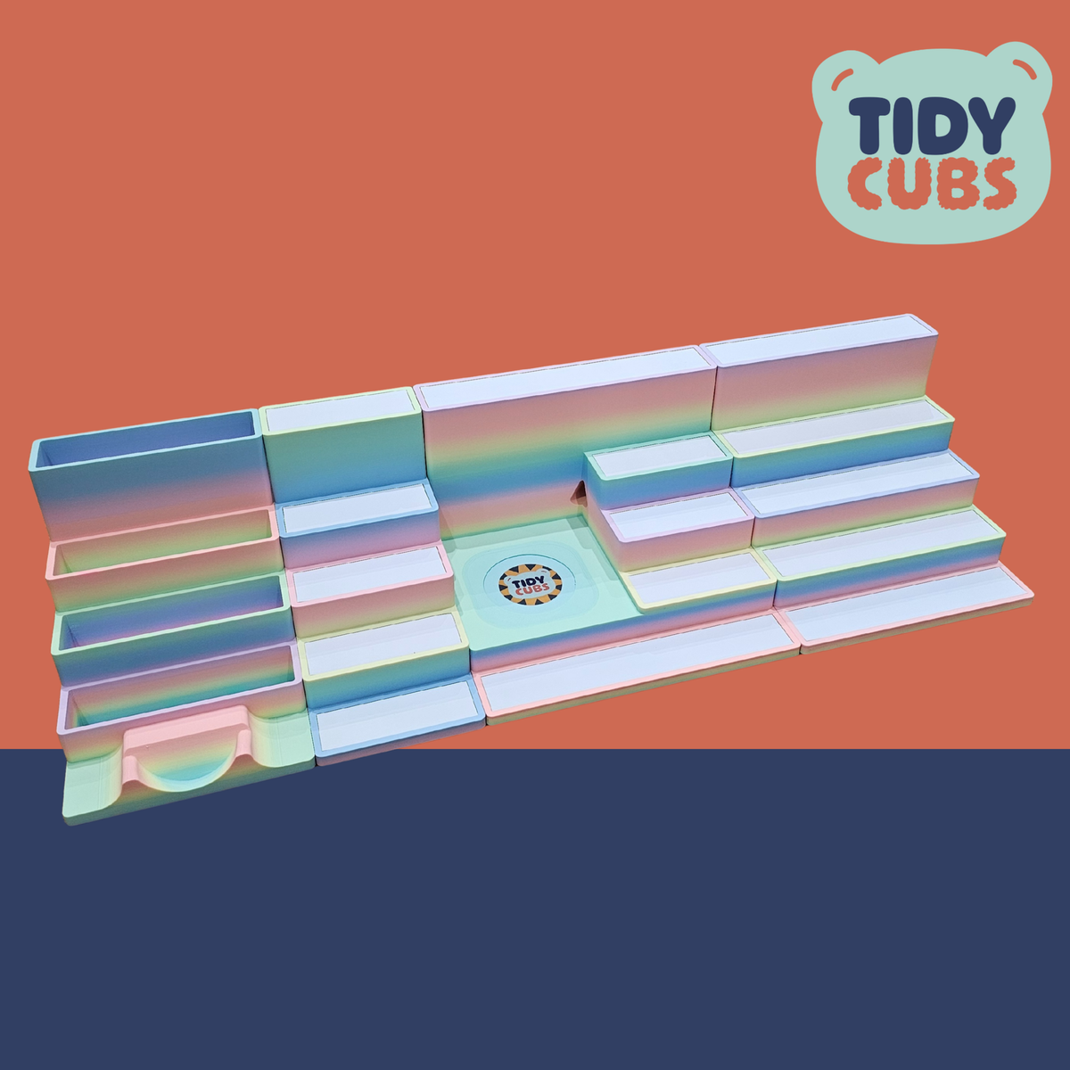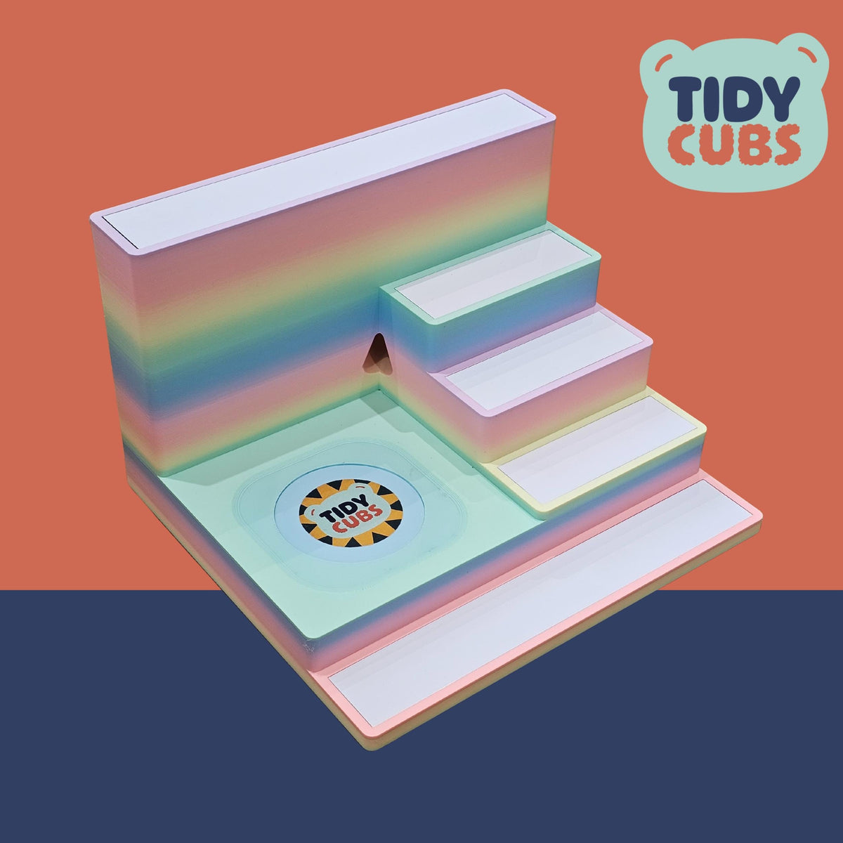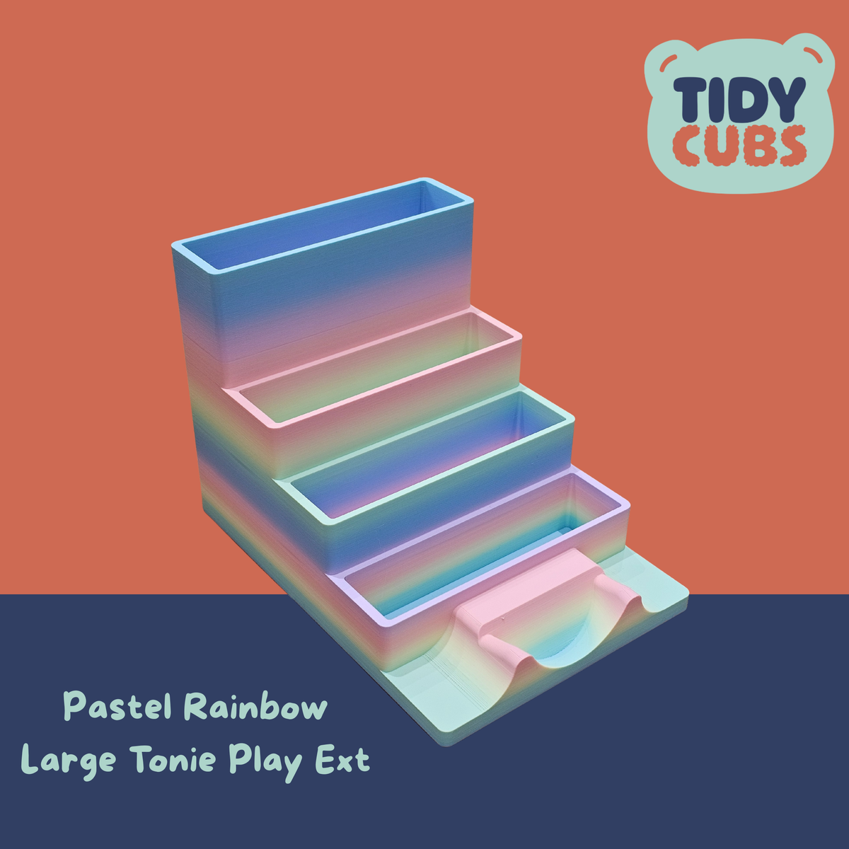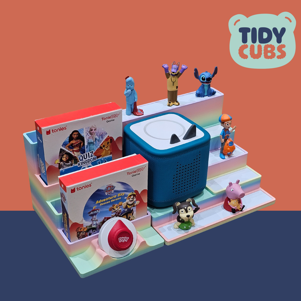 Large Rainbow Modular Tonie Box 2 Docking Station with figure storage acts as a Tonie figure holder for Toniebox 2 stand in kids room decor nursery toy storage Tonies organiser display toy ITEM Securely and neatly store your Tonies figures on this simple but effective storage station. A great way to present your kids Tonies and let them organise them however they wish. Designed specifically to fit the Toniebox 2 and is not compatibility with older Tidycubs products that were for the original box. Each layer of the shelf has a white metallic base to allow the magnetic base of the figure to securely attach itself, this prevents the characters getting knocked off when being moved around or re-organised. You can store up to 3 to 4 characters on each smaller layer of the unit and 5 to 6 on the front larger shelf, so a total of approximately 19 to 25 figures in total could be stored dependant on size of each figure. The width of the each platform layer is 110mm and 235mm for the front/rear platform