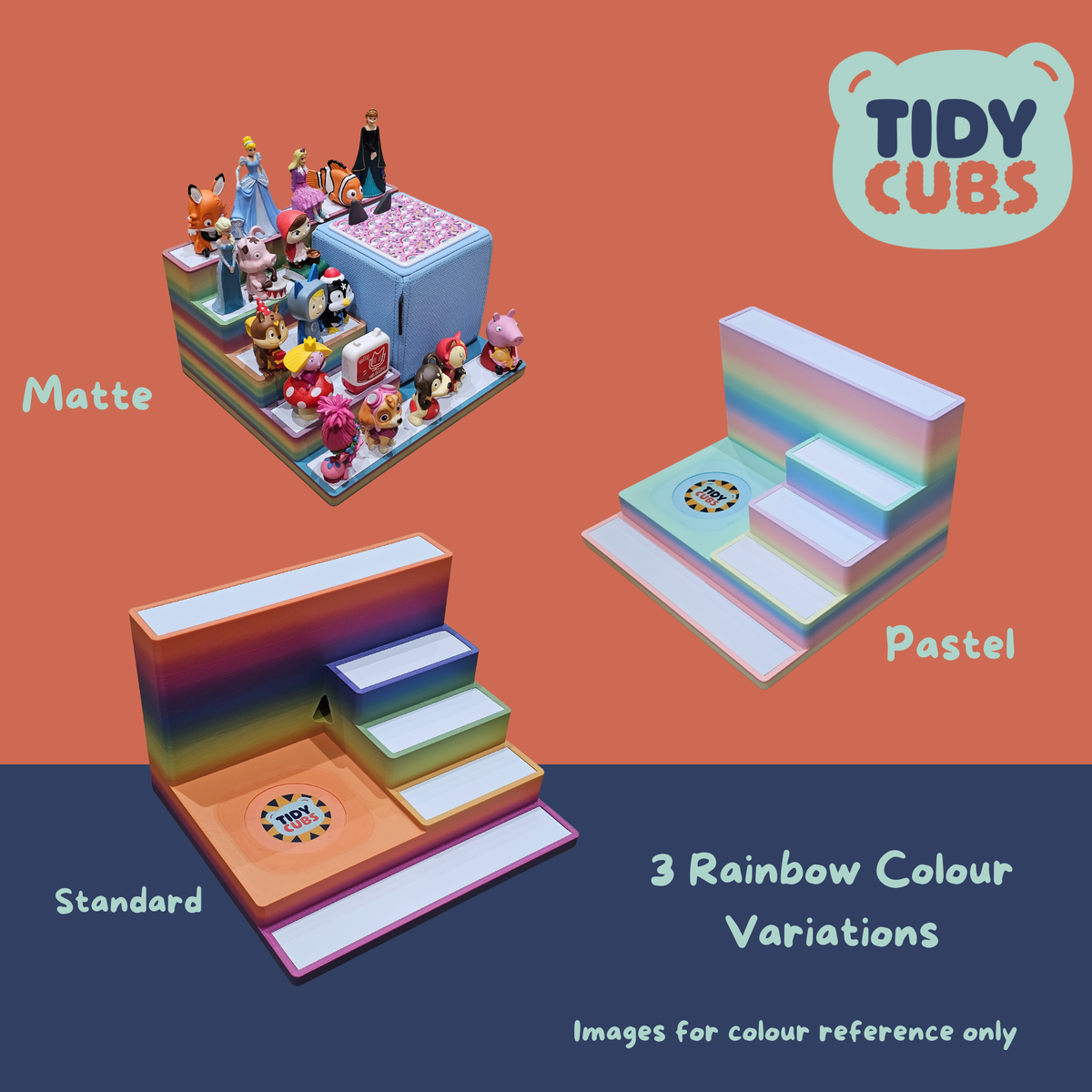 Currently offered in 3 rainbow colours. - Pastel Rainbow - Standard Rainbow - Matte Rainbow - Due to how the rainbow layering works during manufacturing we cannot guarantee each stand will be identical. the rainbow process is very random and no two stands are ever identical.