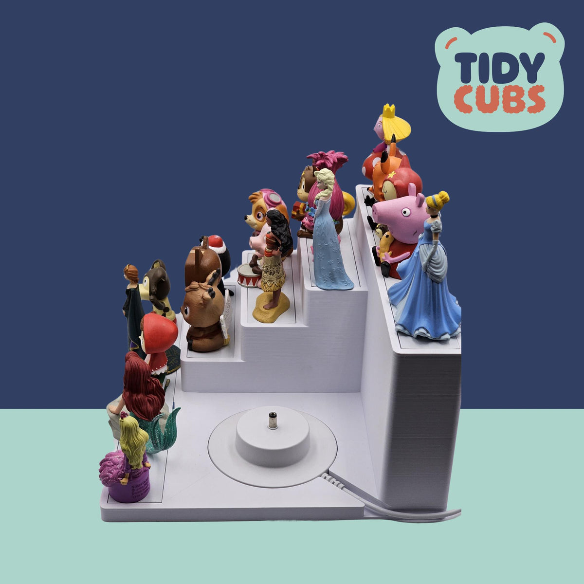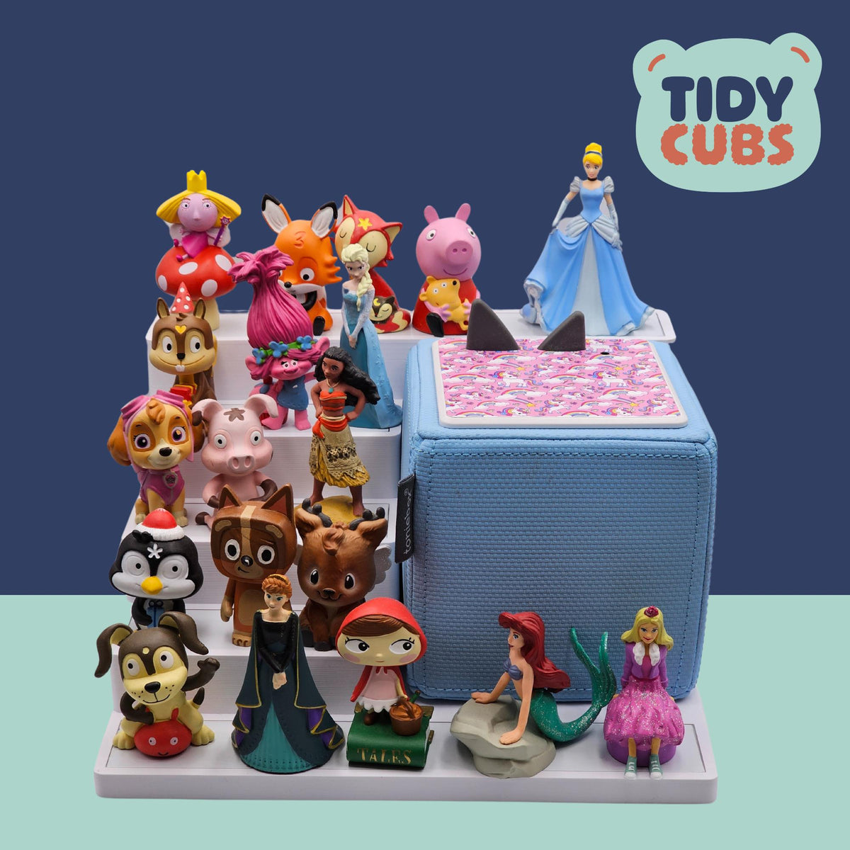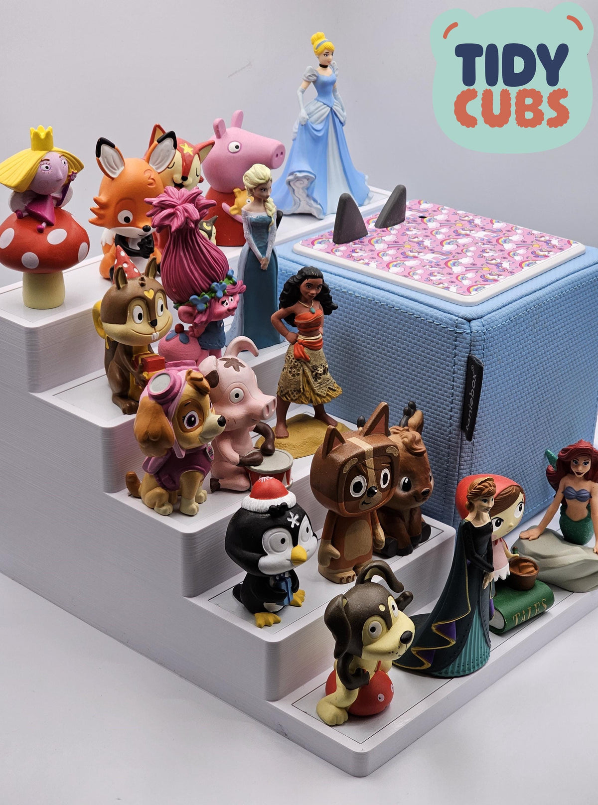 *Please note this item is compatible only with the original Toniebox 1. Securely and neatly store your Tonies figures on this simple but effective storage station. A great way to present your kids Tonies and let them organise them however they wish. Each layer of the shelf has a white metallic base to allow the magnetic base of the figure to securely attach itself, this prevents the characters getting knocked off when being moved around or re-organised. You can store up to 3 to 4 characters on each smaller layer of the unit and 5 to 6 on the front larger shelf, so a total of approximately 19 to 25 figures in total could be stored dependant on size of each figure. The width of the each platform layer is 110mm and 235mm for the front/rear platform